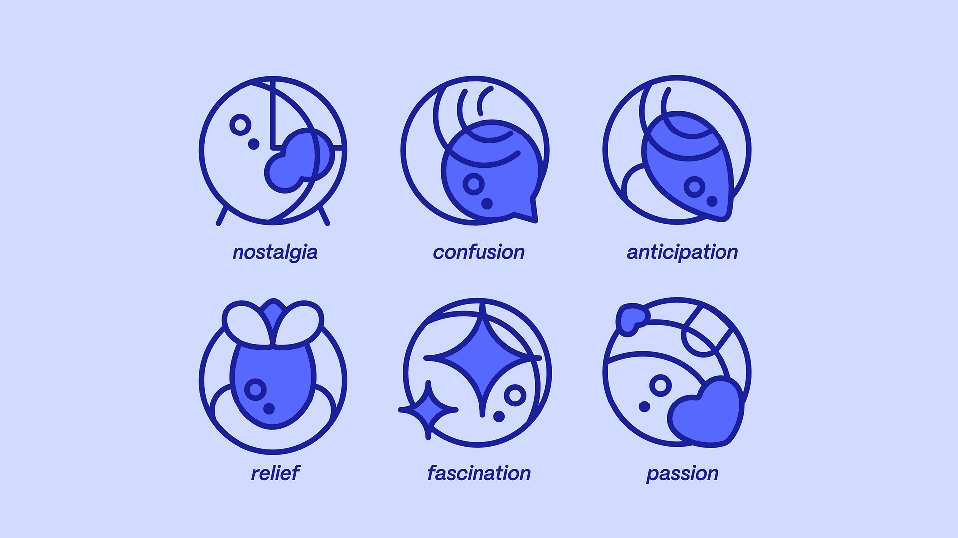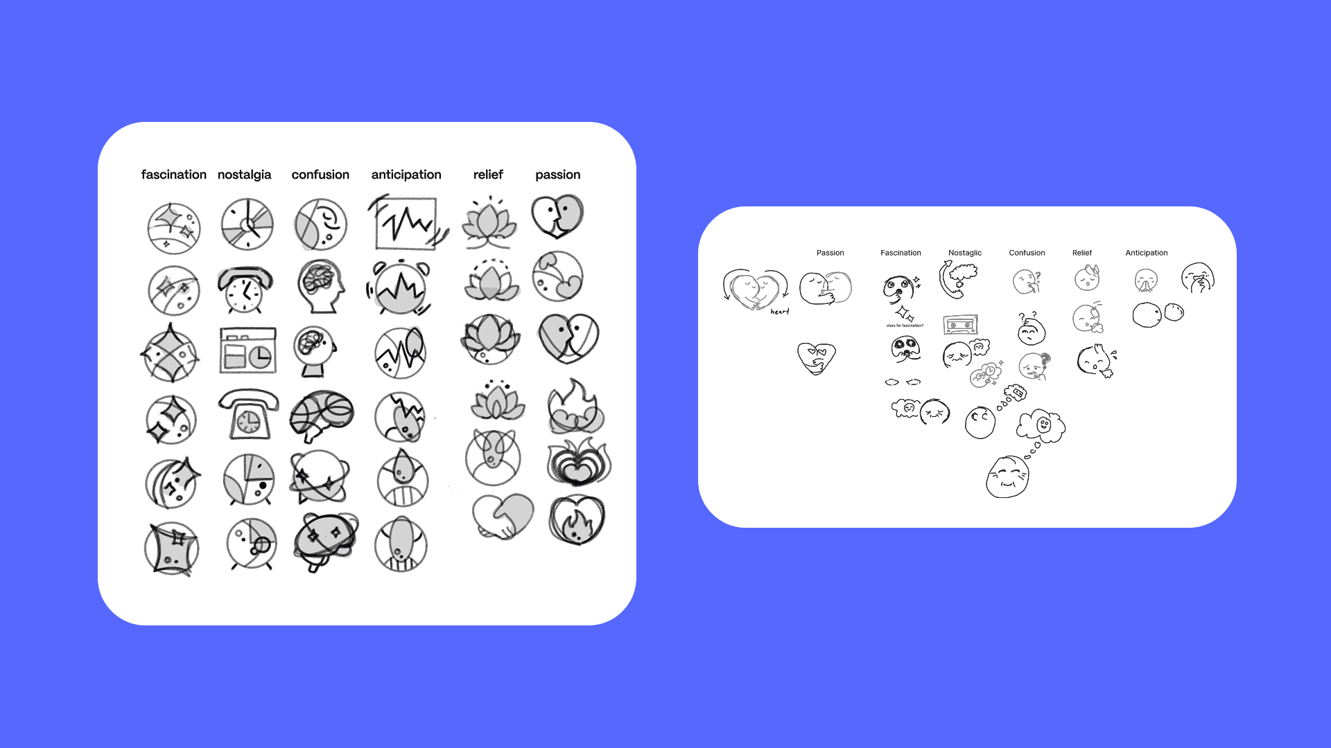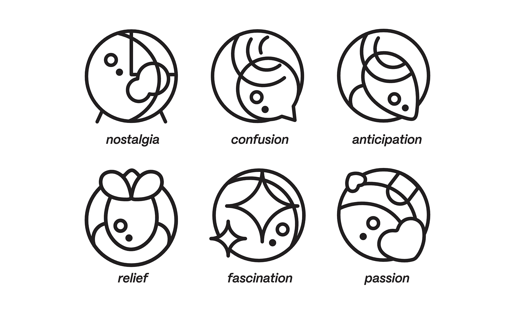 For this project, I designed a series of symbols and icons to visually represent specific emotions. These included nostalgia, confusion, anticipation, fascination, and passion.